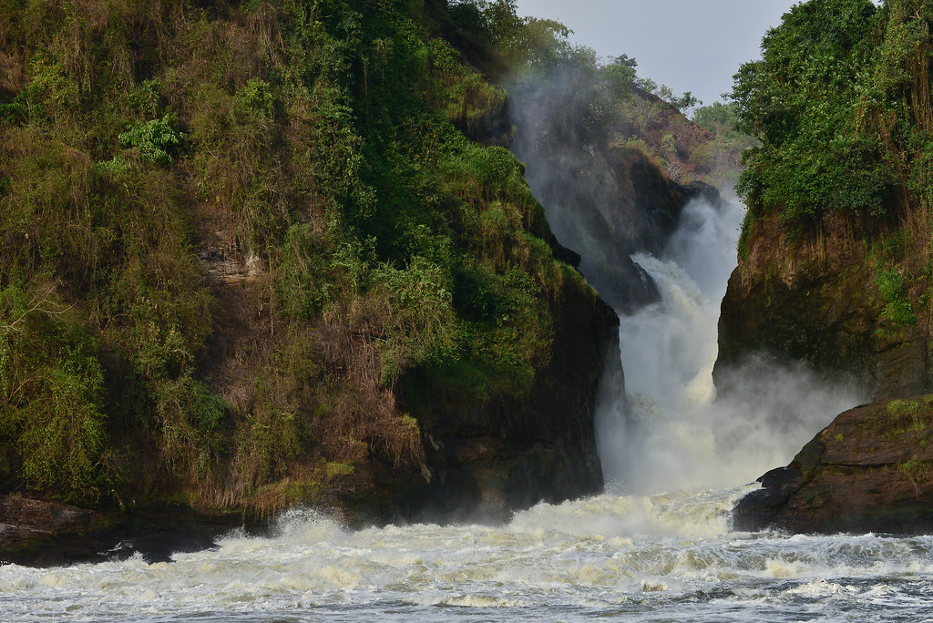 In the afternoon, embark on a boat safari along the Nile River toward Murchison Falls. This cruise passes herds of hippos, crocodiles, and elephant families drinking along the riverbanks, while birdlife thrives on the lush riverine vegetation. Approaching the base of Murchison Falls, you witness the dramatic power of the Nile squeezing through a narrow gorge and plunging over 43 meters below, an awe-inspiring natural spectacle.
