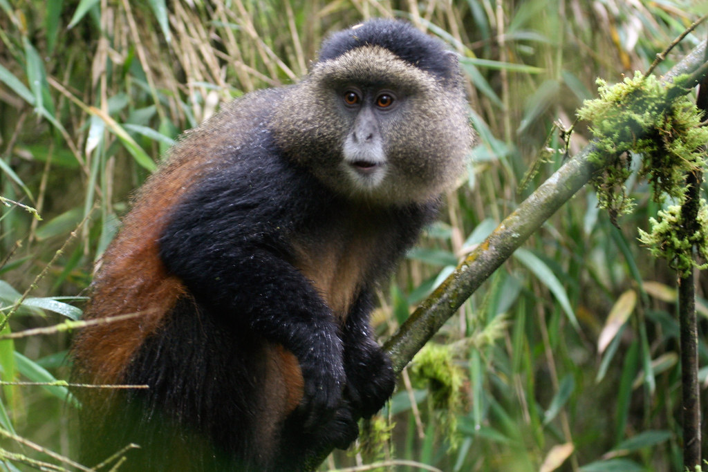 Golden monkeys inhabit the bamboo zones at the base of the volcanoes. Unlike the gentle stillness of gorillas, golden monkeys are energetic and playful. They leap from branch to branch with astonishing agility, their bright golden-orange fur contrasting vividly against the green bamboo.